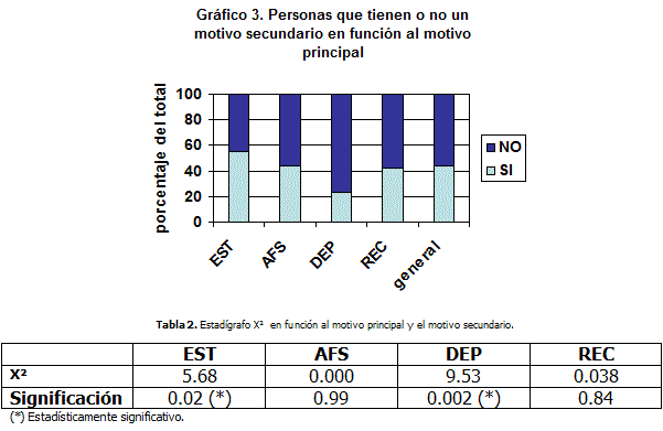 En cuanto a la elección de un motivo secundario, en el gráfico 2 se muestra que la mayoría de las personas encuestadas no lo tiene (54%), seguidos por REC (16%) y AFS (15%), y luego EST y DEP (5%).