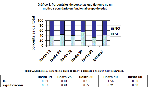 Teniendo en cuenta la existencia o de un motivo secundario, se observa que la tendencia mayoritaria de no poseerlo se mantiene constante a través de los diferentes grupos de edades, a excepción del grupo de edad de 30 hasta 39 años en el cuál la situación se invierte (gráfico 8). En ningún caso se observa un efecto significativo del grupo de edad sobre la presencia o no de un motivo secundario en las personas encuestadas (tabla 6).