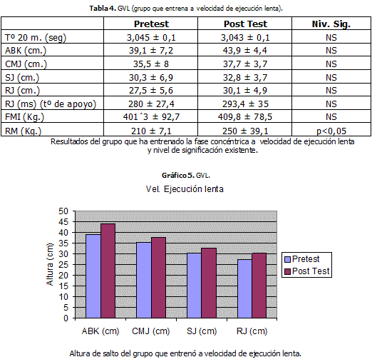 Los resultados del entrenamiento propuesto a los dos grupos que trabajaban a una velocidad de ejecución durante la fase concéntrica fueron los siguientes: