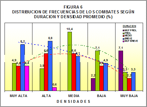 En la figura 4 se presenta la distribución de frecuencias de los combates, evaluaos cualitativamente, de acuerdo con su duración, donde llama la atención la tendencia a agruparse en una doble campana.