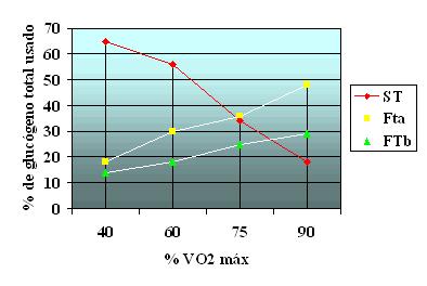 El modelo de agotamiento del glucógeno en las fibras ST y FT depende de la intensidad del ejercicio. De acuerdo a lo que podemos apreciar en la gráfica durante la realización de ejercicios de intensidad relativamente baja (40-60% del VO2 máx), las fibras ST aportan el mayor porcentaje de glucógeno y la contribución de las Fta y Ftb es muy baja. A intensidades de esfuerzo más elevadas (75-90% del VO2 máx), las fibras FT se movilizan con mayor frecuencia y el aporte de glucógeno por parte de estas aumenta considerablemente.