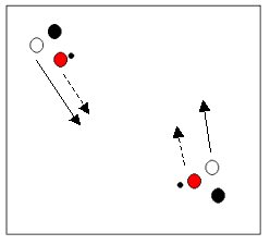 EXPLICACIÓN Pase adelantado a un jugador seguido de un llamamiento. Por grupos de 3 (rojo, negro, blanco) en desplazamiento por una superficie, los de rojo conducen un balón, y los de negro y los de blanco le acompañan. El que lleva el balón llama a negro o a blanco. El jugador nombrado reacciona acelerando hacia una dirección y mantiene su velocidad de carrera, mientras que el que llevaba la pelota debe hacer un pase adelantado al jugador que ha sido nombrado. El pase tiene que llegar a éste sin que se vea obligado a modificar la carrera para controlar el balón. El jugador acompañante y el que llevaba la pelota aceleran para colocarse de nuevo en la situación de partida OBJETIVOS Adaptar el gesto técnico a un llamamiento de balón. Progresar mediante el pase del balón. MATERIALES Tres juegos de dorsales, un balón para cada tres jugadores VARIANTE Colocar una portería en cada extremo del campo y progresar hacia éstas |