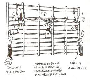 Escalada en triángulo o en círculo: Enganchados a un arnés los alumnos harán ejercicios de escalada a poca altura en triángulo o en círculo. Para que se den cuenta de la dificultad del camino de bajada y no se aventuren por su cuenta en zonas demasiado arriesgadas para ellos, conviene hacer ejercicios de descenso por el mismo camino de subida, descensos en triángulo y en círculo. |