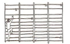 Trepas de mancos y cojos: Trepas y recorridos por las espalderas en todas las direcciones empleando solo los dos pies y una mano. Trepas a pata coja (con las dos manos). Subidas y bajadas de “paralíticos” (empleando únicamente la fuerza de los brazos y tronco), o sea, con las piernas colgando o arrastras. Avances en travesía suspendidos por los brazos. Permanecer suspendidos de los barrotes más altos, el mayor tiempo posible. |