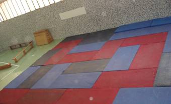 Utilizando diferentes configuraciones del tatami con dos colores de colchonetas: rojas y azules, (jueves: Unidad Didáctica de Equilibrio).