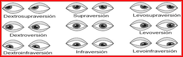 Se producen de esta forma extraversión, levoversión, supraversión, infraversión, dextrocicloversión y levocicloversión, vergencias: Los dos ojos se mueven en sentidos opuestos. Se habla entonces de convergencia (movimiento de los ejes hacia dentro), divergencia (movimiento de los ejes hacia fuera), divergencias verticales, incidovergencia o excidovergencia. Igualmente, se caracterizan por su precisión debido a la elevada especificidad de la inervación de los músculos extrínsecos del ojo. Al mismo tiempo, los movimientos de la cabeza y el cuello, ayudan a orientar la mirada cuando la excentricidad del objeto es grande, estos tienen carácter voluntario se pueden realizar de manera aislada y son, al mismo tiempo, la base de los siguientes movimientos más complejos y de carácter involuntario Hart (1992); movimientos sacádicos, reflejos vestíbulo – oculares y seguimiento ocular.