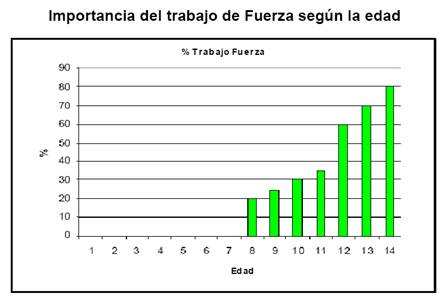 La fuerza aumenta con la edad, hasta la pubertad hablamos de una evolución muy suave producto sin duda del crecimiento físico, esto influye en la forma de trabajar la fuerza, no conviene presentar estímulos de carácter especifico ya que el organismo esta en pleno periodo de crecimiento, pero con una mayor de desarrollo de fuerza de los músculos frente a los huesos, por ello acciones intensas con contracciones rápidas y repetidas, podrían causar daños importantes principalmente en los puntos de inserción.