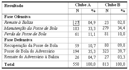 Na Tabela 1 pode observar-se a frequência com que cada princípio táctico, ofensivo (destacados em itálico na tabela) ou defensivo, foi executado por cada uma das equipas. Ao analisar as informações insertas na mesma Tabela, constata-se um número total de acções tácticas de 1363, sendo 550 realizadas pelas equipas do clube A e 813 realizadas pelas equipas do clube B. Tais resultados mostram que as equipas do Clube B realizam um jogo onde é mais evidente a circulação de bola do que acontece com as equipas do Clube A.