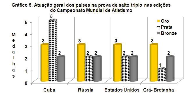 Enquanto a prova de salto triplo masculino foi dominada nas doze edições do Campeonato Mundial de Atletismo pelos saltadores norte americanos, no sexo feminino a Rússia, a qual teve uma fraca atuação no salto triplo masculino durante as doze edições, foi a de melhor atuação. No entanto, se analisarmos a atuação geral por países, isto é, para os sexos feminino e masculino, vemos que as coisas mudam profundamente, pois é Cuba quem historicamente tem dominado a aprova nas edições para os dois sexos (Gráfico 5).