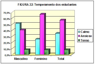 a maioria das garotas considera-se ansiosa (66,7%), enquanto que um grande número de meninos (51,4%) classifica-se como de temperamento calmo. A porcentagem de estudantes que se classificou como tensa é extremamente pequena, nos dois sexos (7,9% das meninas e 8,1% dos garotos).