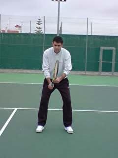 En posición estática, con los pies oblicuos mirando hacia la red, rodillas semiflexionadas. La raqueta se coloca a la altura de la cadera derecha (caso de los diestros).