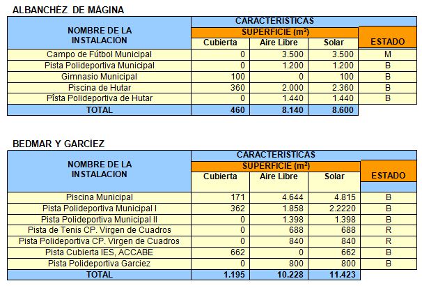 Si se analiza la superficie de instalaciones cubiertas y abiertas, se aprecia que, Mancha Real, con 2.982 m2 y Huelma, con 2.121 m2, son los municipios con mayor superficie de instalaciones cubiertas. En el otro extremo se encuentran los municipios de Noalejo, con 0 m2, y Cárcheles, con 94 m2. En cuanto a la superficie de instalaciones al aire libre, es Jódar, con 35.820 m2 y Mancha Real, con 19.930 m2, los municipios con más superficie. Por el contrario, Torres y Noalejo, son los municipios, con 1.457 m2 y 2.342 m2, respectivamente, con menor superficie deportiva abierta.