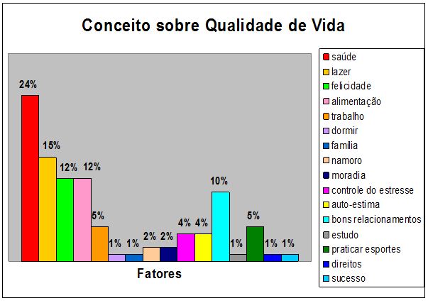 Através do gráfico podemos observar que foram mencionados 16 fatores que os pesquisados associaram ao conceito de qualidade de vida. Percebe-se que os jovens possuem a idéia de que qualidade de vida não é apenas a satisfação com bens materiais, pois a porcentagem de respostas relacionadas a ele foi bem pequena.