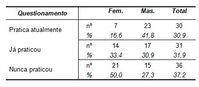 Contudo, atualmente somente 33 alunos (31,2%) estão praticando algum desporto com supervisão de técnico ou professor. Outro dado importante é que 81% das meninas atualmente não está desenvolvendo nenhum tipo de modalidade esportiva, e destas 56% nunca praticaram nenhum esporte. Entre os meninos já se observa outro comportamento, 55% dos alunos não tem uma prática regular de determinada atividade esportiva, e apenas 28% dos meninos nunca praticaram nenhum esporte com frequência.