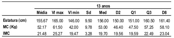 Tabela 3. Valores descritivos e de dispersão dos escores das variáveis: Estatura, Massa Corporal (MC), Índice de Massa Corporal (IMC) de meninas quilombolas.