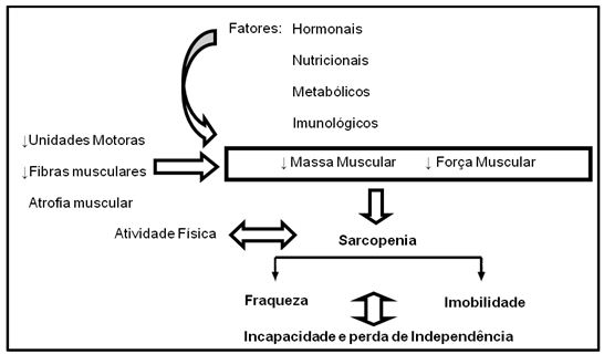 Para Fulle et al. (2004), a sarcopenia resulta de várias mudanças orgânicas, tais como o acúmulo de tecido conjuntivo, a redução do número e tamanho das unidades motoras, associados à desenervação progressiva e diminuição da síntese de miofibrilas, devido à atrofia por desuso entre outras. Por outro lado, Doherty (2003) reporta que essa alteração músculo-esquelética é significativamente influenciada pela perda de fibras do músculo esquelético e diminuição do número de motoneurônios.