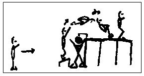 9. Un quitamiedos levantado de forma horizontal, con varios cubos detrás, de forma que queden más o menos a la misma altura, y delante de estos, un minitramp, se trata de saltar hacia arriba sobre el minitramp, cayendo en los cubos tras superar el quitamiedos, intentando girar en el aire cayendo sentado o de cuclillas.