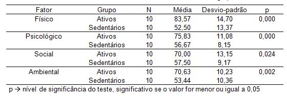 Após a pontuação dos domínios condizentes ao questionário, através do programa estatístico SPSS, verificou-se pelo teste t-student, que o grupo dos idosos ativos, ou seja, praticantes de corrida, possui um escore para a qualidade de vida significantemente superior em todos os domínios, quando comparado ao grupo de idosos sedentários (Tabela 3).