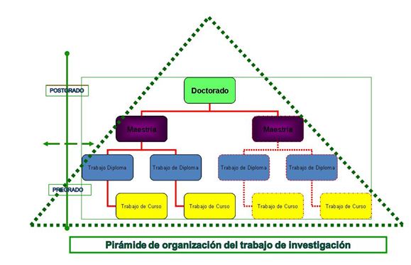 Esta pirámide de organización del trabajo de investigación funciona en la comunidad como sistema de los actores sociales que se forman en los Centros Universitarios Municipales desde el pregrado y postgrado de acuerdo a los objetivos investigativos para cada uno de ellos, que se integran en la solución de problemas que se presentan en la comunidad, en este caso en relación a los procesos de la recreación física en la comunidad. Al funcionar como grupo en la solución de problemas sociales que se presentan en la comunidad cada uno de ellos investigará en función de los objetivos que se exigen para los trabajos de curso y diploma en la formación como profesional y en los diplomados, maestría y doctorado en la formación de postgrado, desde el nivel inferior en este caso los trabajos de cursos de determinada disciplina o asignatura tributa con sus resultados a los estudiantes que desarrollan trabajos de diplomas de culminación de estudios, éstos a su vez tributan a los que desarrollan en la comunidad maestrías y los resultados de las maestrías como base para los doctorantes que desarrollan la investigación en la solución de los mismos problemas sociales pero con mayor valor agregado.