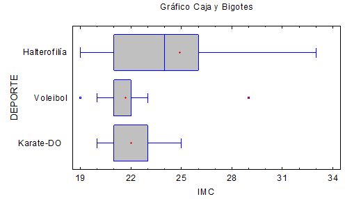 La gráfica de cajas y bigotes permite comparar ilustrativamente los valores macroantropometricos de los deportistas de la selección de levantamiento de pesas, voleibol y karate-DO.