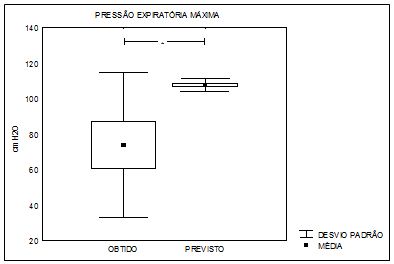 Neste estudo observamos uma diminuição significativa da PImáx obtida (55±26 cmH2O) versus PImáx prevista (119±40 cmH2O) e da PEmáx obtida (70±37 cmH2O) versus PEmáx prevista (126±43 cm H2O), conforme ilustrado nas figuras 1 e 2.