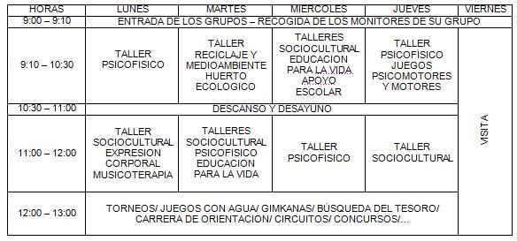 Socio-cultural: sesiones originales con juegos variados, concursos, acertijos y sugerencias festivas que se prolongaban durante y después de los desayunos. Los talleres que se recogen en esta área van desde el teatro o la dramatización y la expresión corporal o juegos sensoriomotrices, actividades de animación a la lectura y apoyo escolar, manualidades, expresión musical, etc.