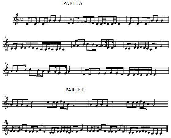 Parte B: que se subdivide en B y B’ de 5 compases cada una.
