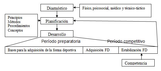 Lo anterior puede concretarse en la planificación del entrenamiento con tareas que de forma sistemática y durante un largo período realizan los deportistas cuya ejecución garantiza el logro de la forma deportiva para cada competencia, esta planificación del entrenamiento se organiza en un sistema formado por varios componentes dialécticamente relacionados, su estructura, según Roque (2004, p. 6) “…garantiza no solo el rendimiento en sí, sino el cuándo se obtiene; o sea, la correcta dirección de la forma deportiva”.