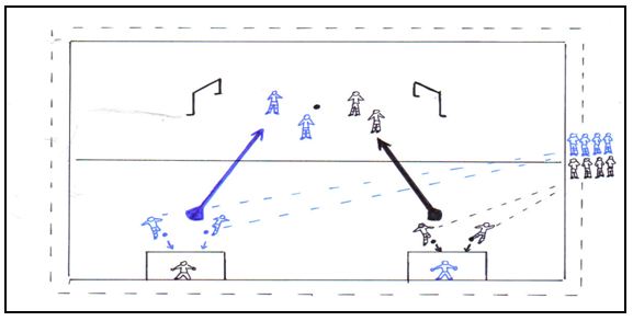 Al frente de ellos se colocarán 3 arcos móviles separados ampliamente entre ellos. El entrenador dará ordenes metodológicas de realizar tiros a puerta a dichos arcos los cuales en ocasiones pueden estar defendidos por defensas.