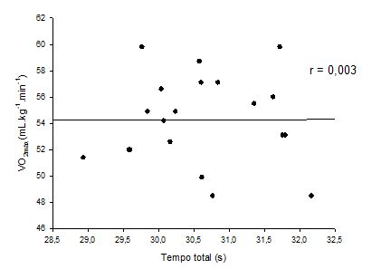 A figura 2 ilustra o resultado da correlação (r = 0,003) entre o VO2máx e o tempo total dos seis sprints.