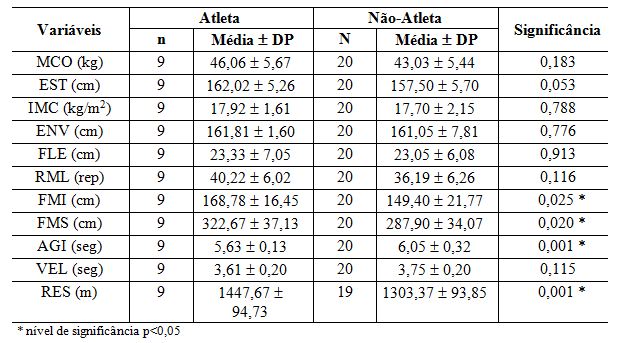 Serão apresentados os respectivos valores de n, média e desvio padrão das variáveis mensuradas, bem como a apresentação do nível de significância de cada variável entre os grupos de atletas e não atletas.