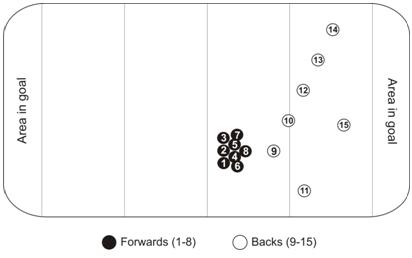 Cada equipe é composta por 15 jogadores, os quais são divididos em dois grupos que desempenham duas funções distintas durante a partida (Nicholas, 1997; Scott et al. 2003). As equipes são basicamente formadas por Forwards (oito integrantes que possuem a função de recuperar a posse de bola quando um jogador é derrubado ou durante as formações fixas) podem ser considerados os defensores do time e os Backs (sete jogadores com função de avançar pelo campo adversário e marcar pontuações). Devido à característica do jogo, estes atletas atuam em bloco (FIGURA 1), devendo ter como atributos predominantes a força muscular e uma grande estrutura corporal para os Forwards, já os Backs utilizam a velocidade e potência muscular para que possam realizar seu papel no jogo.