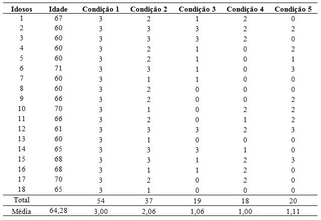 Na tabela 3 estão expressos os resultados dos idosos nas cinco tarefas, podemos perceber, pela soma dos escores e pela média que conforme o nível de dificuldade foi aumentando, os idosos obtiveram menores escores na realização das tarefas. As atividades com maior número de movimentos a ser realizados foram as que os idosos apresentaram maior dificuldade. Outro fato interessante para destacarmos é que nem sempre os idosos mais jovens conseguem os melhores resultados, por exemplo, na condição experimental 5, um senhor de 71 anos conseguiu obter escore 3 enquanto muitos participantes de 60 anos não conseguiram se quer escore 1.