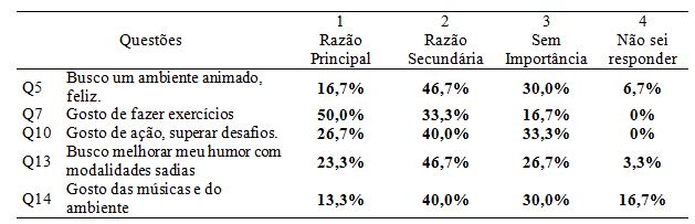 A tabela 2 mostra os percentuais atribuídos para as perguntas relacionadas ao fator divertimento e a questão 7 “gostar de fazer exercícios” obteve 50% de atribuição, sendo o maior percentual da razão principal, demonstrando assim que a motivação esta presente nas sessões de treinamento através do gostar de praticar os exercícios, sendo esta uma questão de grande importância na adesão da musculação, uma vez que para alcançarmos nossas metas dentro de um esporte ou em alguma atividade física, é necessário que o ser humano esteja motivado para que possa ter a capacidade de manter os esforços na presença de estímulos negativos e positivos segundo (BRANDÃO, 2003).