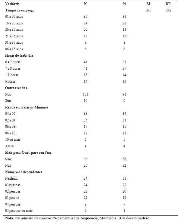 As idades dos participantes da pesquisa variam de 18 a 57 anos, com uma a média de idade de 40 anos (DP= 10,02). Foi encontrada na amostra uma quantidade um pouco maior de homens n=60 (54%) do que de mulheres n=51 (46%). A maioria destes correspondendo a 73% é casada, 20% são solteiros e o restante são viúvos ou separados.