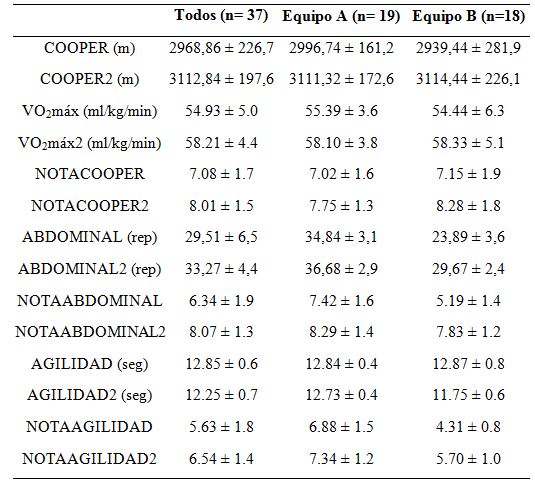Las pruebas de fiabilidad de las variables muestran unos valores medios-altos (Tabla 5) excepto en la variable de agilidad que en el equipo B (senior) existen valores repetidos puesto que se refiere a milisegundos de diferencia entre los tests de los 37 participantes. Por esta razón no se tendrá en cuenta en la discusión y conclusiones del estudio.