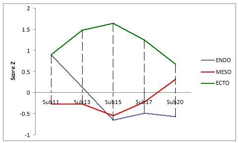 Os resultados apresentados na Figura 3, demonstraram certa coerência quanto ao componente Mesomórfico, que se manteve aproximadamente constante ao longo das categorias (Sub11: -0,27 e Sub20: 0,31), A Ectomorfia descreve evolução aproximadamente parabólica, novamente convergindo à evolução fisiológica maturacional com pico no Sub15 (1,63) e mínimo no Sub20 (0,67). Aspecto, similarmente válido à Endomorfia, porém sua evolução foi muito mais rígida, dado que no Sub11 era 0,89 e no Sub20 alcançou -0,57. Todos os componentes da somatotipia apresentaram diferença significativa.