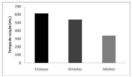A Anova one-way (3 grupos) conduzida registrou diferença entre os grupos [F(2, 27)=11,596, p=0,0002]. O teste post-hoc Tukey determinou que o tempo de reação do grupo de crianças ginastas foi superior ao grupo de adultos (p=0,00654), e ainda adultos apresentaram menores TR que crianças (p=0,00033) e não houve diferença entre o grupo de crianças ginastas e crianças (p=0,4015).