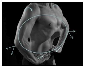En el terreno práctico, cada postura articular incluida en los ejercicios de TH ha sido estudiada para responder a las pautas de ejecución anteriormente descritas. Sirve de ejemplo la rotación interna de los hombros, en flexión de codos a 90º y flexión dorsal de las muñecas, al máximo de las posibilidades articulares como se muestra en la figura 2. La repetición diaria de los ejercicios, crea a largo plazo redes neuronales reverberantes es decir, circuitos autoexcitadores en situación postural. Dicha estimulación postural y respiratoria conducen a una tonificación por vía refleja del suelo pélvico (aumento del 58 % del tono de reposo) y de la faja abdominal (Caufriez, Fernández, Deman y Wary-Thys, 2007).