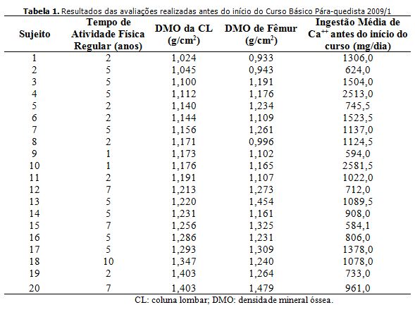 Com relação à classificação dos sujeitos segundo os níveis de DMO, No presente estudo, foi o único voluntário (1 da Tabela 1 e 2) que relatou possuir um quadro de osteoporose familial (avó materna). O mesmo voluntário foi o único que concluiu tendo laudo clínico de osteopenia densitométrica pré e pós o curso tanto na coluna lombar como no fêmur. A osteoporose pode estar associada a fatores genéticos (FROES et al., 2002). Os resultados da Tabela 2 mostraram que apenas um voluntário (numero 2) regrediu de uma condição normal do fêmur para um quadro de osteopenia, possivelmente devida a elevado estresse física sobre os MMII durante o período de treinamento (MOTTINI et al., 2008).