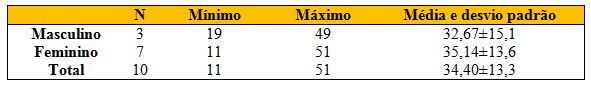 No quadro 1 são apresentados os dados descritivos da amostra relacionados ao sexo e idade cronológica. Nota-se maior prevalência de participantes do sexo feminino (70%) quando comparado ao masculino (30%). No que se refere à idade cronológica, observa-se primeiramente que a amostra é heterogênea, entretanto, não apresenta ampla diferença entre as médias quando comparadas por sexo.