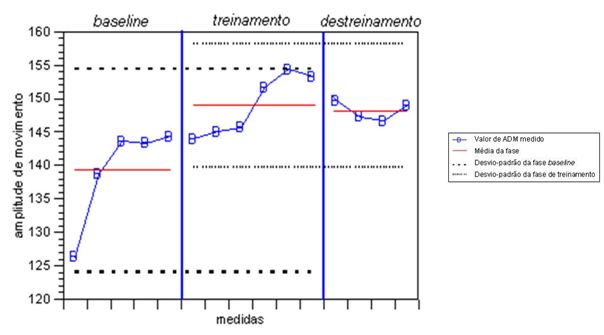 O método de análise utilizado para comparação da flexibilidade foi a “faixa de dois desvios-padrão”. Esse procedimento de analise envolve a avaliação da variabilidade da fase de baseline calculando-se a faixa de dois desvios-padrão da media da fase. Uma vantagem deste procedimento é que ele pode ser aplicado quando há um pequeno número de dados na baseline (OTTENBACHER, 1986; PORTNEY e WATKINS, 2000). Um efeito é considerado significativo quando, no mínimo, dois pontos consecutivos da fase subsequente ficam fora (acima ou abaixo) da faixa de dois desvios-padrão da fase anterior.