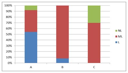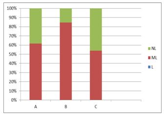 El gráfico nos muestra los resultados por criterios: en el criterio A el 54% de los niños logra mantenerse por 15 seg en equilibrio con un pie, mientras que 38% medianamente logra mantenerse por 15 seg. Y el 8% no logra mantenerse por 15 seg. El criterio B muestra que el 8% de los niños logra utilizar sus brazoz para mantener el equilibrio, 92% medianamente logra utilizar sus brazos. El criterio C muestra que el 70% de los niños medianamente logra mantiener el equilibrio sin la necesidad de cambiar de pie, y el 30% no logra mantener el equilibrio sin cambiar de pie.