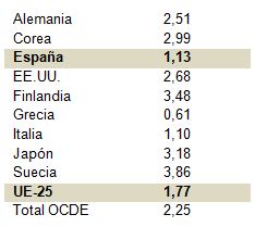 Tabla 1. Gasto en I+D como porcentaje del PIB 2005 a nivel internacional (OCDE, 2007)