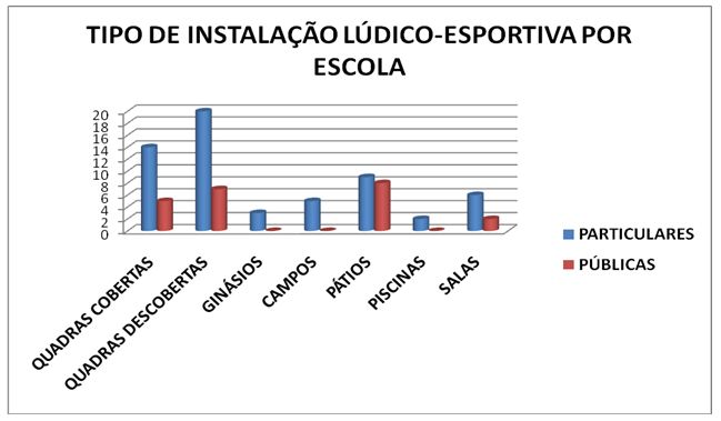 As escolas particulares possuem em maior quantidade todos os tipos de instalações lúdico-esportivas estudadas, ilustrando a grande disparidade de oferta de instalações para a prática de educação física.