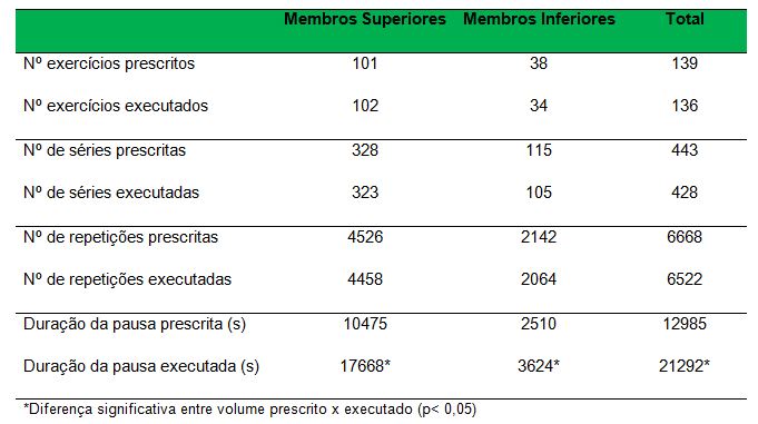 A Tabela 1 abaixo apresentamos o comparativo entre o número de exercícios, séries, repetições e duração das pausas prescritas e executadas para os membros superiores e inferiores dos praticantes de musculação.