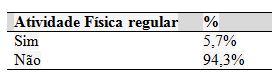 No que concerne a adesão a atividade física observou-se que apenas 5,7% dos pacientes aderem à atividade física, dessa forma verifica-se um baixo nível de adesão atividade física, a atividade física para hipertenso pode contribuir para redução dos níveis pressóricos, atuando de forma sinérgica para redução da pressão arterial, dessa forma diminuindo as chances de aparecimentos de complicações como acidente vascular cerebral e síndromes coronárias. Os diversos benefícios para a saúde, a partir da prática regular de atividades físicas, são amplamente divulgados para a sociedade. Como exemplo, a facilidade de realizar atividades diárias de forma autônoma, diminuição da pressão arterial e da freqüência cardíaca de repouso, melhora na captação de oxigênio, maior resistência à fadiga, diminuição da gordura corporal, melhora da auto-estima. Os benefícios são fisiológicos, metabólicos, psicológicos, antropométricos e neuromusculares, além da diminuição dos riscos de desenvolvimento de doenças crônicas como câncer, diabetes mellitus tipo 2, osteoporose, obesidade, entre outras (McARDLE; KATCH e KATCH, 2008; WILMORE; COSTILL e KENNEY, 2010; MATSUDO e MATSUDO, 1992; SILVA, 2010). Esses resultados elevados de não a adesão a atividade física corroboram com os dados da adesão a atividade física em pacientes diabéticos da mesma cidade que foi de 63,89% (CERQUEIRA et al., 2011).