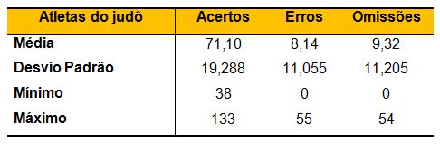 Comparando os dados, a média de acertos: 71,10 é mais alta que as médias encontradas de erros e omissões: 8,14 e 9,32 respectivamente, evidenciando que os atletas de judô apresentam um alto nível de rapidez e exatidão de percepção. Um estudo utilizando o mesmo instrumento foi realizado por Barbosa (2010), que teve como população 268 jovens de ambos os sexos, com idades entre 14 e 18 anos, praticantes de diversas modalidades individuais e coletivas no contexto do esporte escolar de rendimento. Em relação aos acertos o sujeito que teve maior número teve 133 acertos e o que fez o menor número teve 12, sendo a média encontrada 67,97 e um desvio padrão de 29,119. O número máximo de erros encontrados no grupo de jovens escolares foi 20 e o mínimo 0, apresentando uma média de 2,53 e desvio padrão 3,832. Já o número máximo de omissões foi 52, o mínimo 0 e desvio padrão de 10,360.