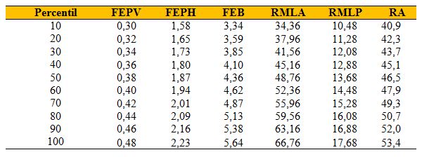 Para a determinação dos parâmetros de aptidão física dos atletas futebolistas de campo da categoria infantil do sexo masculino realizaram-se testes físicos nas capacidades específicas para jogadores de futebol de campo. Na Tabela 2 têm-se os resultados dos índices de força explosiva de pernas vertical (FEPV) e horizontal (FEPH) de braços (FEB), resistência muscular localizada de abdômen (RMLA) e de pernas (RMLP), resistência aeróbia (RA), flexibilidade (FLEX), agilidade (AGIL) e velocidade de deslocamento (VD).