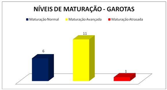 Nesse contexto Pires e Lopes (2004) afirmam que meninas apresentam um estirão mais cedo e de período mais curto por volta dos 12 anos. O presente estudo no que concerne aos níveis maturacionais das garotas, pode-se verificar que a maturação avançada como maioria sendo identificada em onze (11) garotas, seis (6) com maturaçao normal e com maturação atrasada apenas uma (1).